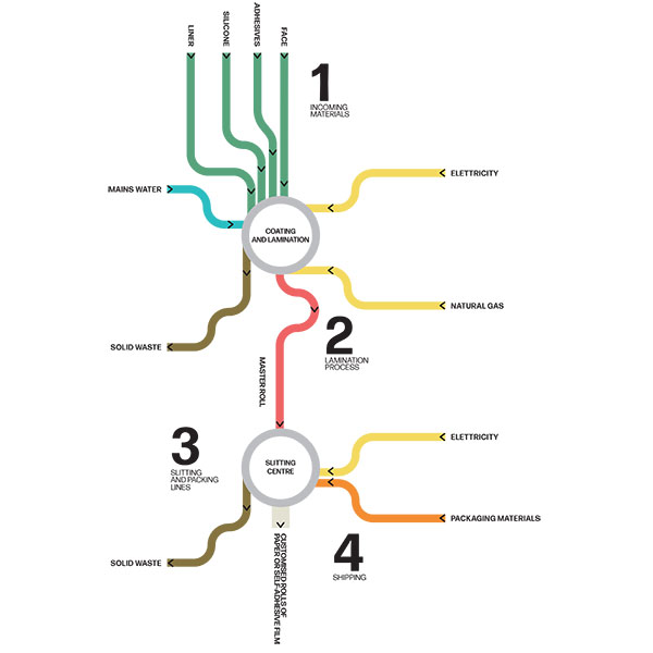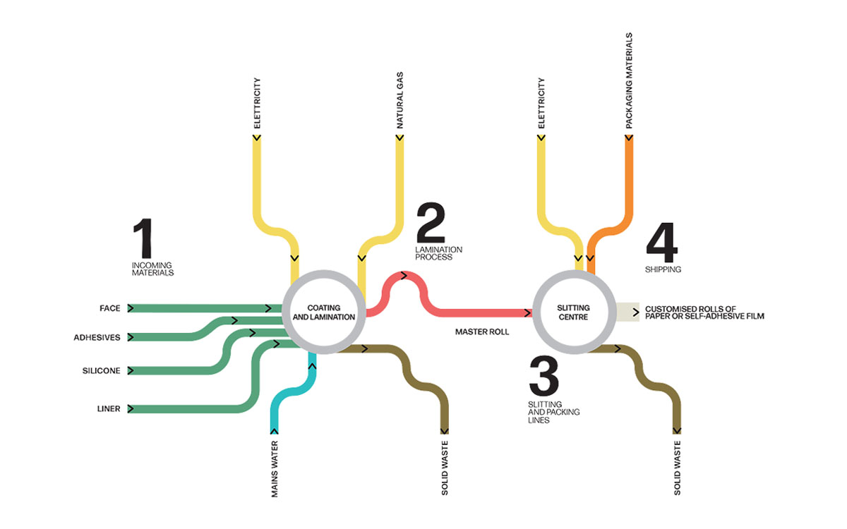 The self-adhesives production process uses paper reels and films (plastic and non-plastic) as raw materials. The environmental impact in terms of water consumption is significantly less than that of paper production, about 2%.There are basically two processing methods: silicone coating, which for more than 20 years, at all our plants, has involved the exclusive use of raw materials that are free of toxic solvents; and adhesivation, through the application of the adhesive to the silicone-coated support, which is then transferred to the face material (label).